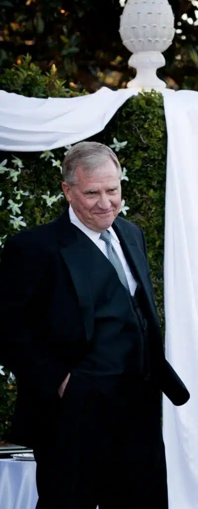 The music stopped and Dale began the ceremony. About two minutes in he heard pop and felt his pants loosen. He had lost a pin. He continued on delivering this beautifully crafted ceremony message from the iPad he held. He had worked for weeks word-smithing every part of the Ceremony to perfection for our girl. Then another pop and the pants loosened again. Time for the prayer – a third pop! He knew there was only one more pin holding him together. He immediately without any sudden moves went to Plan B. He carefully turned and laid the iPad down on the table nearby and put both hands in his pants pockets. He reared back in a John Wayne style, and began to conduct the Ceremony off the cuff to be best of his remembrance. It came time for him to lead the Bride & Groom in Communion and share the elements of bread and wine with them. In the most natural way, he asked the Groom as his first official act to serve his wife Communion. No one was aware that his hands were too busy holding up his pants to serve Communion himself. The Groom did just as he was instructed. We moved into the Family Prayer with the parents joining the couple, and Dale’s hands never left his pockets. Then the Kiss and the Introduction of the Bride and Groom for the first time. The music rang out and the wedding participants and guests all made their way out to the reception.
